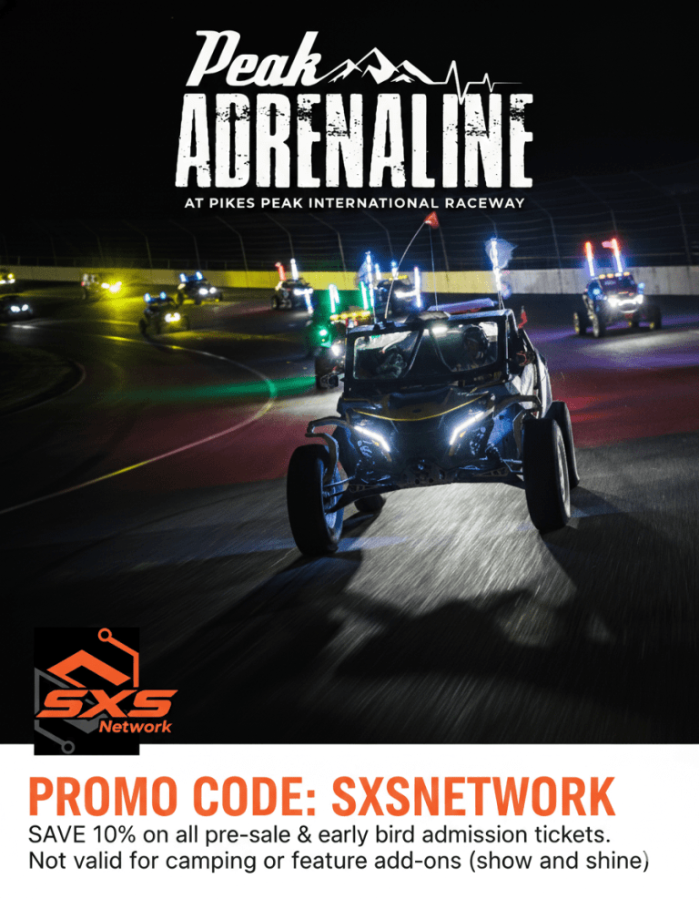 Select options This product has multiple variants. The options may be chosen on the product pageGet ready for Peak Adrenaline, Colorado’s premier Side-by-Side festival hosted right here at Adrenaline Park! From high-speed thrills on The Gauntlet race course to testing your technique on over 600 acres of off-road trails, this is the ultimate dirt weekend for every SxS enthusiast. Experience four days of action, including live music, the “Summer of Smoke” burnout competition, and our legendary Adrenaline Park After Dark glow rides.