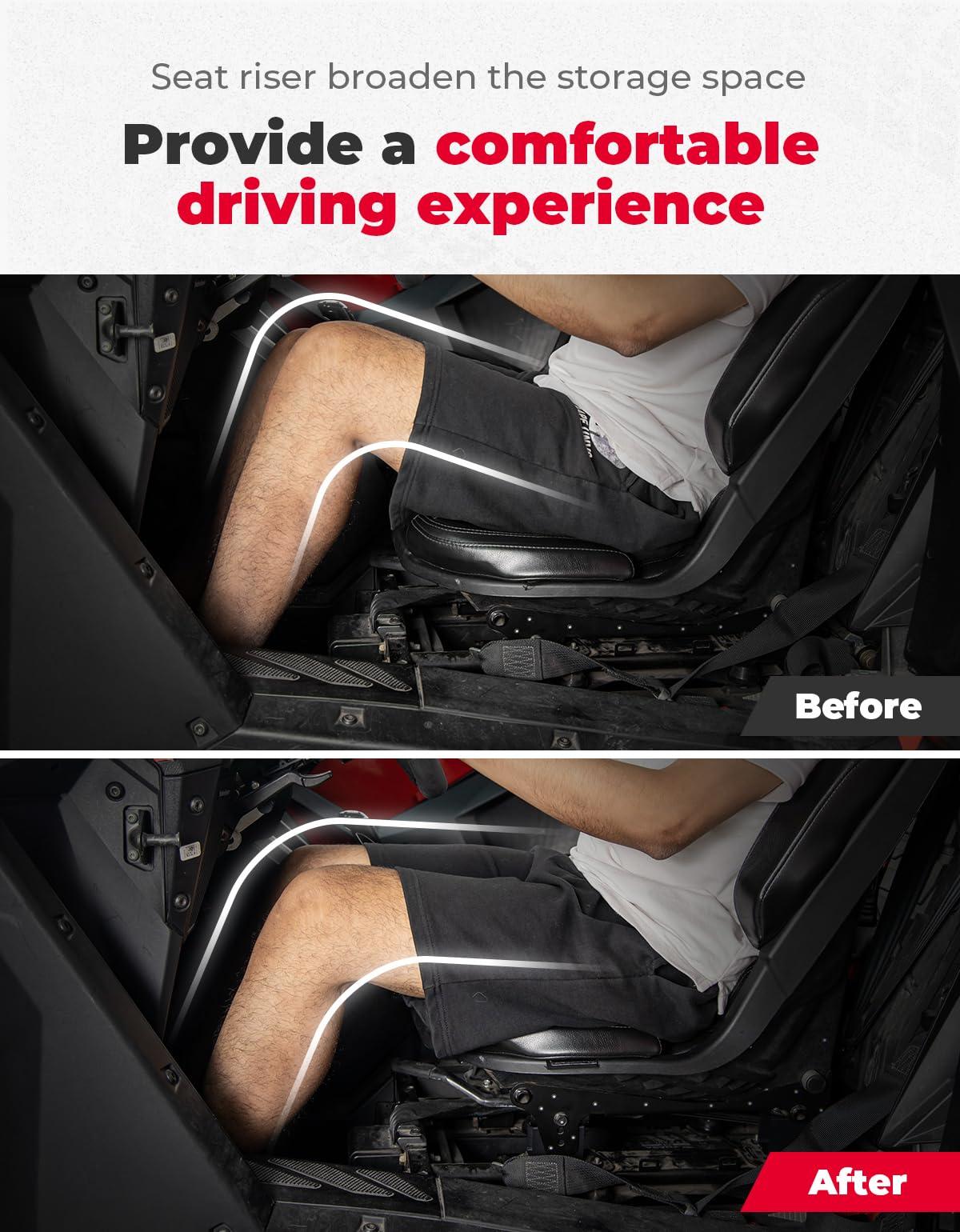 The seat risers kit broaden storage space next to the seat and does not squeeze into your legs when you store some items.