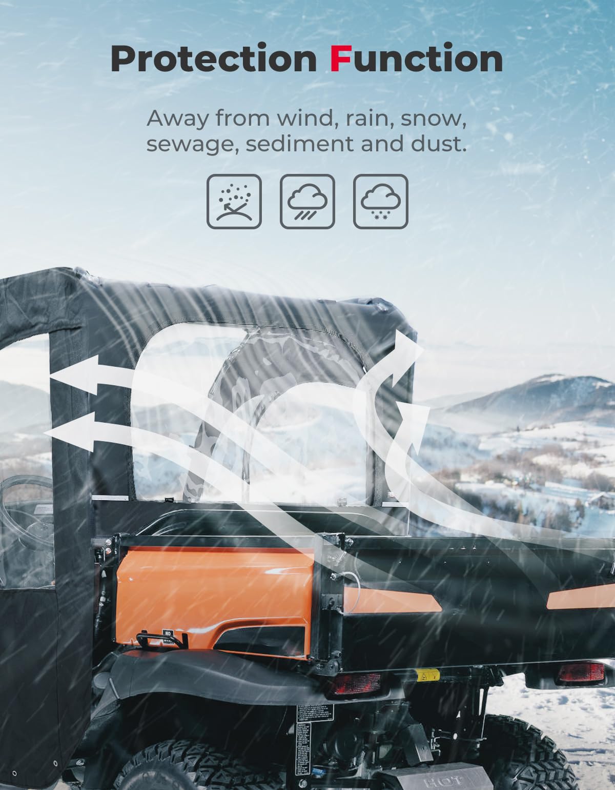 KEMIMOTO door&rear enclosure protects against sun, rain and dust in summer and wind, snow and cold in winter. If you feel that the air is not circulating and you need ventilation, you can roll up the transparent film (both door and rear enclosure can be rolled up).Universal for all seasons.