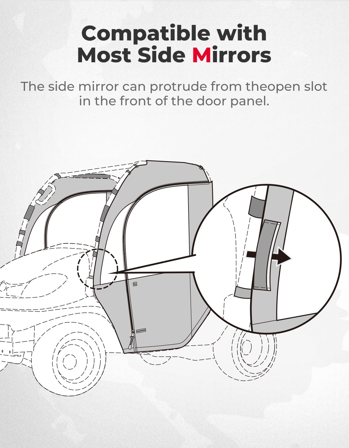 The front is designed with removable webbing and self-adhesive, compatible with most windshields on the market. The back is designed with a zipper to allow ventilation without completely removing the back. The sides are left open to allow the mirror to protrude without causing the front to leak. The zipper teeth are wrapped in cloth so that the zipper is not easily damaged and does not affect the smoothness of the zipper.